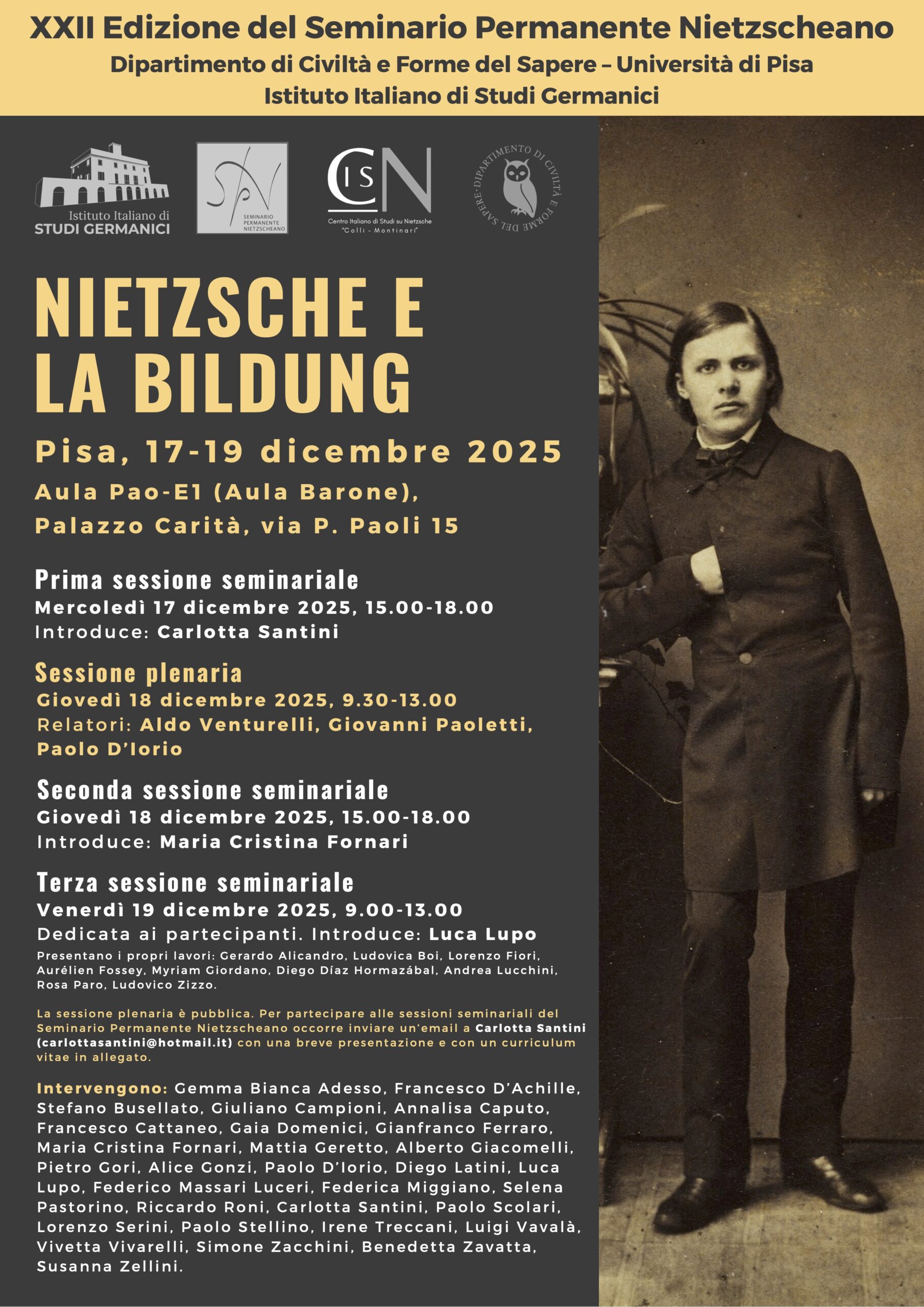 | Pisa | « Il filologo classico come educatore? », XXII Seminario Permanente Nietzscheano: Nietzsche e la Bildung, Université de Pise, 18 décembre 2025. | |